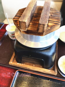 注文してほどなくするとセットが運ばれてきます。用意された固形燃料に着火してもらい、暫くすると木蓋のわきから湯気が上がってきます。炊きあがるまでのあいだは茶碗蒸しやセットの刺身などをいただいて待つ事にします。注文時から合計25分くらいでしょうか、燃料が燃え尽きると、炊き上がりとなります。