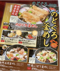 車でよく通る街道筋に「華屋与兵衛」鎌取店があることを思い出して、3月17日(木)11:00amごろちょっと寄ってみました。「のどぐろ釜めしフェア」はまだやっていました。