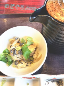 ここでわが迂闊さに気がつきました。食べながら写真ばかり撮っていたので時間を費やし、折角のお出汁が冷めてしまったのです。これは失態でした。ぬるいお茶漬けではちょっと興ざめですね。それでもこの「のどぐろ窯めし」はお茶づけに適するように合わせたお味だということはよくわかります。下味がついていますからだし茶漬けではなく、熱いお茶をかけてもいいとおもいます。