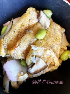 炊きあがった窯の木蓋を除き中をみますと、のどぐろ半身3枚が中央に並べられて、椎茸や枝豆などんの具材が見えかくれしています。のどぐろはほぐし身やフレーク状ではなく、小ぶりながら上身(じょうみ)にされたものがカットなしで使われていました。のどぐろの身であることが、しかと確認できます。皮目が上に盛られて、うっすらと焼き目(?)がほどこされ、なかなかの演出だとお見受けいたしました。(^ω^)