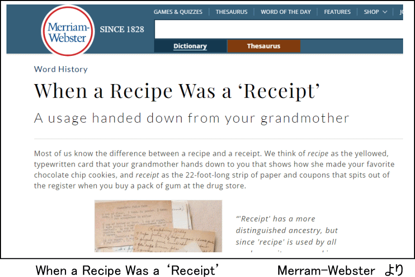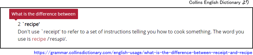 というタイトルのページで、receiptとrecipeにかかわるウンチクが述べられ、使用例も豊富に掲載されています。一部を抜き書きします⇊