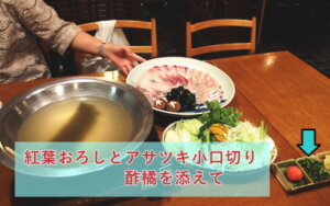 鍋の中に一度にたくさんの具材を放り込まないでください。ご自身が食べる分だけを箸に取りしゃぶしゃぶしてください。そしてポンズ醤油にそっと浸したら、すぐに召し上がってください。それを召し上がってからつぎの具材に移りましょう。